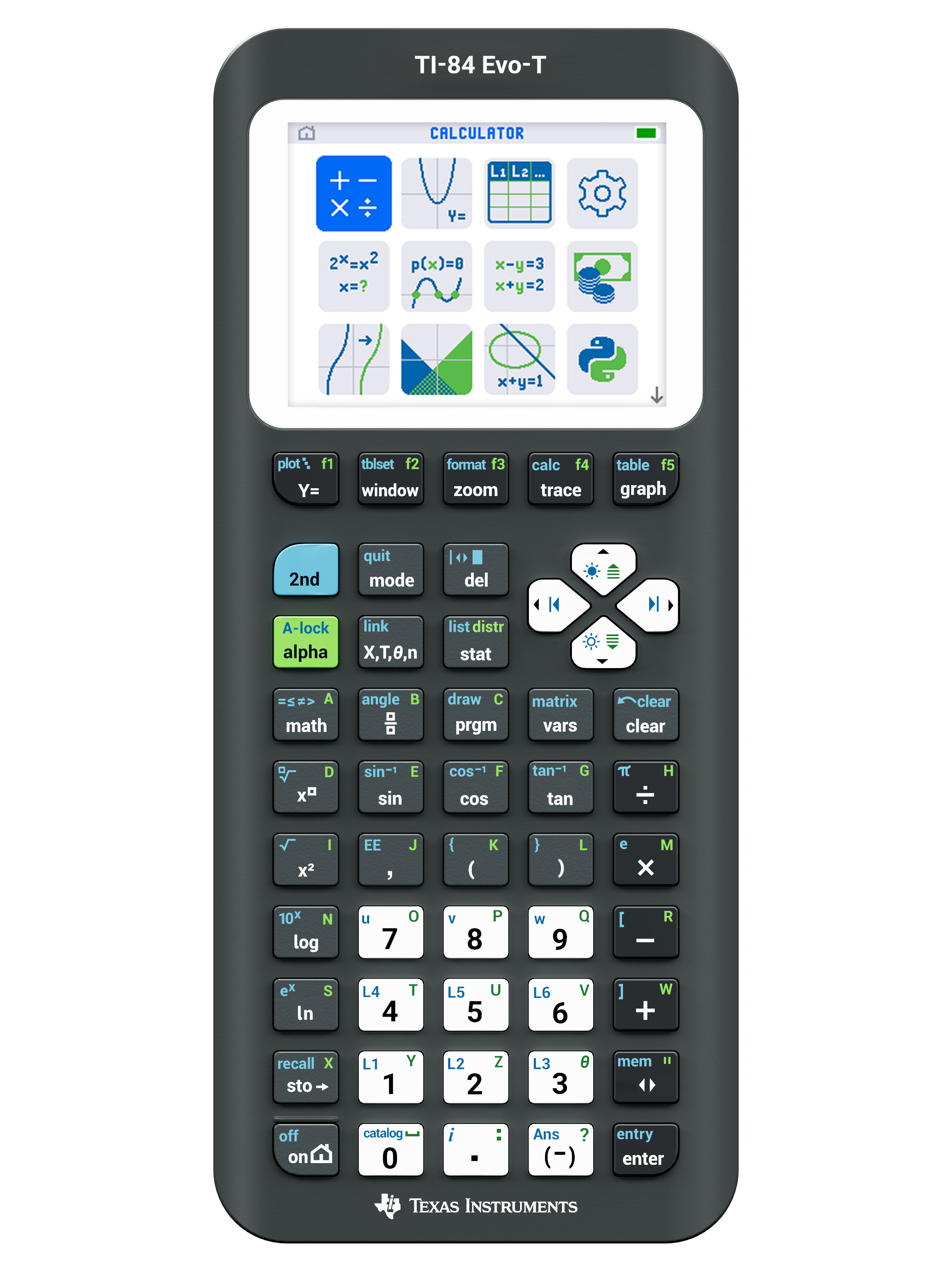 The TI-84 Evo-T graphing calculator delivers faster performance, bigger and clearer visuals, and an intuitive interface that's easy to use and easy to learn.
